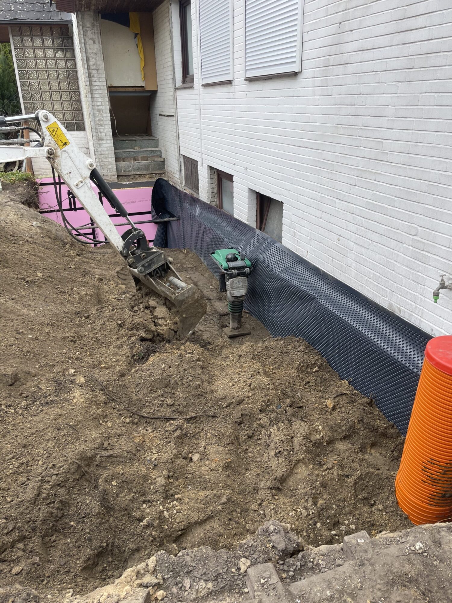 Zu Beginn wird der betroffene Bereich freigelegt und die bestehende Abdichtung beurteilt. Anschließend bereiten wir den Untergrund vor, schließen Fehlstellen und tragen das gewählte Abdichtungssystem in den erforderlichen Schichten auf. Danach folgen Perimeterdämmung, Schutz- und Dränschichten. Zum Schluss wird der Arbeitsraum lagenweise verfüllt und verdichtet. Alle Schritte werden von uns begleitet und dokumentiert.